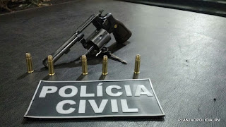 Próximo ao local foi localizado abandonado um Revólver calibre 38 municiado com 06 munições intactas e 04 aparelhos celulares que haviam sido roubados minutos antes, conforme relatos de duas vitimas que compareceram na delegacia logo após terem sido avisadas sobre a prisão do suspeito.